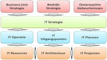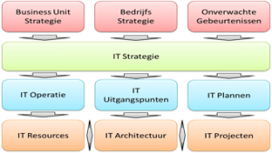 Ook kun je in dit schema zien dat er input nodig is om de IT strategie te kunnen maken. Vanzelfsprekend is de algemene bedrijfsstrategie nodig en daarnaast de afgeleide businessunit strategie voor zover die afwijkt van de algemene strategie. Tot slot moet je rekening houden met dingen die je nog niet weet. Bijvoorbeeld overnames of een ramp…