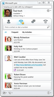 In de visie van Microsoft wordt Lync de backbone van alle communicatie tussen mensen. Of het nu gaat om het voeren van een telefoongesprek, een chat of een video conference call of het uitwisselen van een document, Lync zit in het hart. Eigenlijk zie je dat al zodra je Lync gebruikt. De presence functie komt in elke toepassing naar voren.