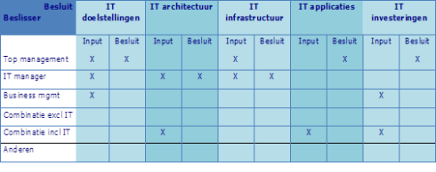 Voor elk van de besluiten geldt dat er meerdere personen betrokken moeten zijn bij het leveren van input en het nemen van de besluiten ten aanzien van de vijf onderdelen. Je kunt deze personen, hun input en beslissingen en de vijf IT besluiten in een Governance Arrangements Matrix vormgeven waarbij je ook kunt vaststellen wie input levert of eindverantwoordelijk is. De invulling geeft een voorbeeld van het niveau waar een besluit over het algemeen wordt vastgelegd en input kan worden gegeven.