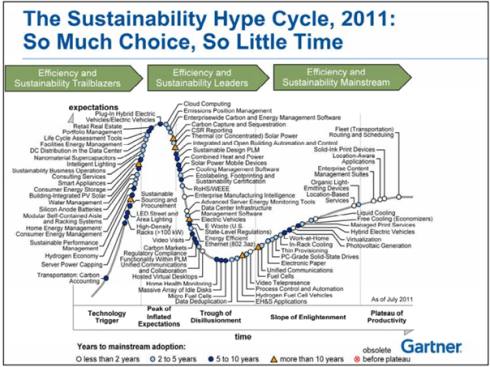 Op het gebied van Green IT zie je dat de grootste aandacht de komende drie tot vijf jaar uitgaat naar gebouwbeheersing. Maar ook het opwekken van eigen energie wordt een trend voor de komende jaren, vooral voor datacenters. Onderstaande hype cycle geeft een goed voorbeeld van diverse technologische trends die een invloed hebben op duurzaamheid en GreenIT.