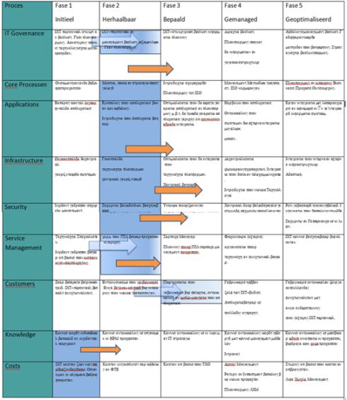Door onderzoek te doen naar de stadia waarin elk van de negen processen zich bevinden, krijg je een beeld van de totale kwaliteit van ICT. Aan de hand van die plaatsbepaling kun je dan de stappen definiëren om de kwaliteit te verbeteren zodat gegroeid kan worden naar een volgende volwassenheidsfase. Overigens is het in dat geval belangrijk om eerst alle negen stadia in eenzelfde fase te krijgen.
